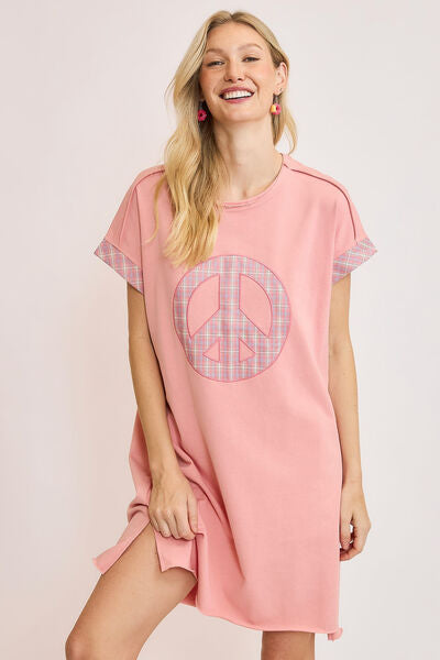 Umgee Peace Plaid Applique Short Sleeve Mini Dress